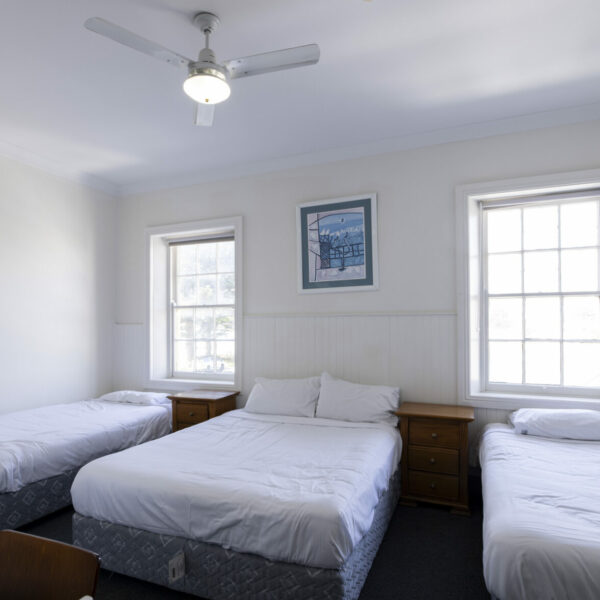 Located on the first floor, our quad room sleeps four adults, with a queen bed and two king singles, and features a private ensuite bathroom. Fan, tea and coffee making facilities and complimentary toiletries. Iron and ironing board are available upon request.